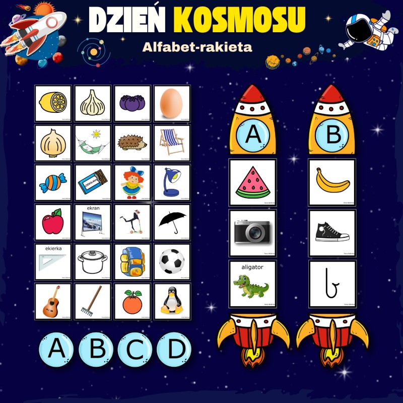 Ten edukacyjny zestaw do wycinania to świetna aktywność dla dzieci, które uczą się liter i rozpoznawania pierwszych głosek w słowach. Składa się z obrazków z przedmiotami i zwierzętami, które należy dopasować do odpowiednich rakiet oznaczonych literami. Zadanie rozwija spostrzegawczość, logiczne myślenie oraz umiejętności językowe w atrakcyjnej, kosmicznej oprawie. Idealny pomysł na Dzień Kosmosu, zajęcia przedszkolne, edukację domową i naukę przez zabawę!