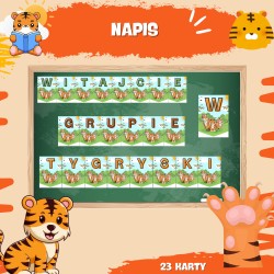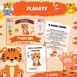 Grupa przedszkolna Tygryski to tematyczna grupa, której celem jest wspieranie dzieci w procesie adaptacji, nauki i zabawy w przedszkolu. Dzięki spójnej identyfikacji wizualnej i przyjaznej nazwie, dzieci czują się częścią zgranego zespołu, co pomaga budować poczucie bezpieczeństwa, przynależności i wspólnoty. Zestaw materiałów dla grupy Tygryski zawiera wszystko, co potrzebne do stworzenia atrakcyjnej przestrzeni edukacyjnej: kąciki tematyczne, logo grupy na drzwi, plakaty oraz znaczki na szafki. Dodatkowo w zestawie znajdują się korony i odznaki, które pełnią funkcję nagród za udział w zajęciach i różnego rodzaju aktywnościach.