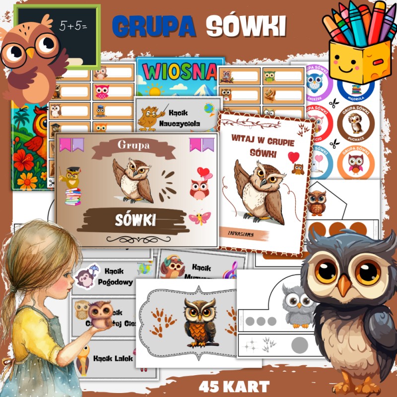 Grupa przedszkolna Sówki to wyjątkowa, tematyczna grupa, która wspiera dzieci w adaptacji do życia przedszkolnego, rozwijaniu umiejętności oraz budowaniu pozytywnych relacji. Mądra sówka jako symbol sprzyja atmosferze nauki i odkrywania świata, a spójna identyfikacja wizualna sprawia, że dzieci czują się częścią bezpiecznej i zgranej społeczności. Zestaw materiałów dla grupy Sówki zawiera wszystko, co potrzebne do stworzenia przyjaznej przestrzeni edukacyjnej: kąciki tematyczne, logo na drzwi, plakaty oraz znaczki na szafki. Dodatkowo dołączone są korony i odznaki, które pełnią rolę nagród i zachęcają dzieci do aktywnego udziału w codziennych zajęciach.