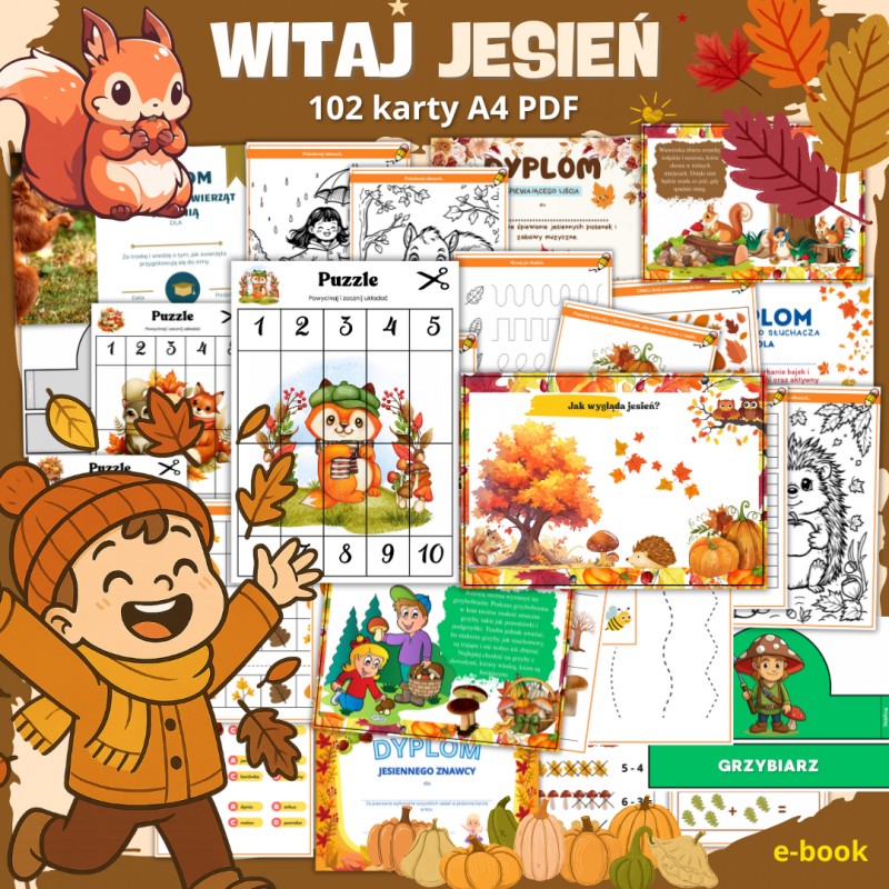 Jesień to niezwykła pora roku, pełna kolorowych liści, kasztanów, żołędzi i darów natury, które stwarzają wiele okazji do zabaw i nauki w przedszkolu. Dla dzieci to czas odkrywania zmian w przyrodzie, obserwowania pogody i poznawania jesiennych zwyczajów. Zestaw „Witaj Jesień” to bogaty ebook stworzony specjalnie dla nauczycieli i rodziców, którzy chcą w ciekawy sposób wprowadzić najmłodszych w świat jesiennych tematów. W środku znajdziesz m.in. scenariusze zajęć, karty demonstracyjne, aż 32 zabawy, bajkę z zadaniem, łamigłówki, rysowanie po śladzie, odwzorowywanie obrazka, zadania matematyczne, kolorowanki, memory, puzzle, odznaki, dyplomy, korony oraz napis ozdobny.