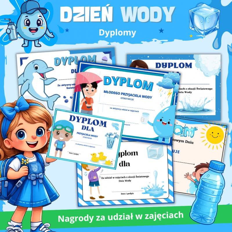 Zestaw dyplomów na Dzień Wody to piękne, kolorowe nagrody za udział w zajęciach i aktywnościach tematycznych. W komplecie znajdują się różne wzory, m.in. Dyplom Młodego Przyjaciela Wody, Dyplom dla Przyjaciela Wody oraz pamiątkowe dyplomy za udział w obchodach Światowego Dnia Wody. Ilustracje z kroplą wody, dziećmi i motywami wodnymi przyciągają uwagę i sprawiają radość najmłodszym. Wystarczy wpisać imię dziecka, datę i podpisać. Gotowe do druku pliki PDF oszczędzają czas i ułatwiają organizację zajęć. To idealne dopełnienie scenariusza na Dzień Wody – kupujesz, drukujesz i wręczasz wyjątkową pamiątkę.
