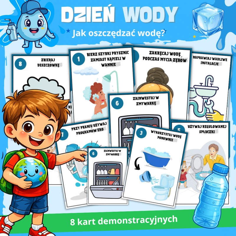 Karty demonstracyjne „Jak oszczędzać wodę?” to edukacyjny zestaw PDF do druku idealny na Dzień Wody w przedszkolu i klasach 1–3. Zawiera 8 czytelnych plansz pokazujących praktyczne sposoby oszczędzania wody, m.in. szybki prysznic zamiast kąpieli, zakręcanie kranu podczas mycia zębów, używanie programów eko czy zbieranie deszczówki. Kolorowe ilustracje ułatwiają zrozumienie tematu i zachęcają dzieci do dbania o środowisko. Materiał sprawdzi się podczas zajęć ekologicznych i rozmów kierowanych. Pliki A4 są gotowe do wydruku. Kup zestaw i przeprowadź wartościowe zajęcia bez dodatkowych przygotowań.