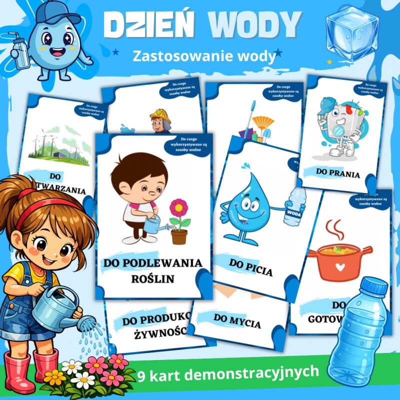 Karty demonstracyjne „Zastosowanie wody” to edukacyjny zestaw PDF do druku na Dzień Wody dla przedszkola i klas 1–3. Zawiera 9 plansz pokazujących, do czego wykorzystujemy wodę na co dzień, m.in. do picia, gotowania, mycia, prania, podlewania roślin oraz produkcji żywności. Czytelne ilustracje pomagają dzieciom zrozumieć znaczenie wody w życiu człowieka i uczą świadomego korzystania z zasobów. Materiał idealny na zajęcia ekologiczne i rozmowy kierowane. Format A4 umożliwia szybki wydruk i pracę z całą grupą. Kup zestaw i przygotuj wartościowe zajęcia bez zbędnych przygotowań.