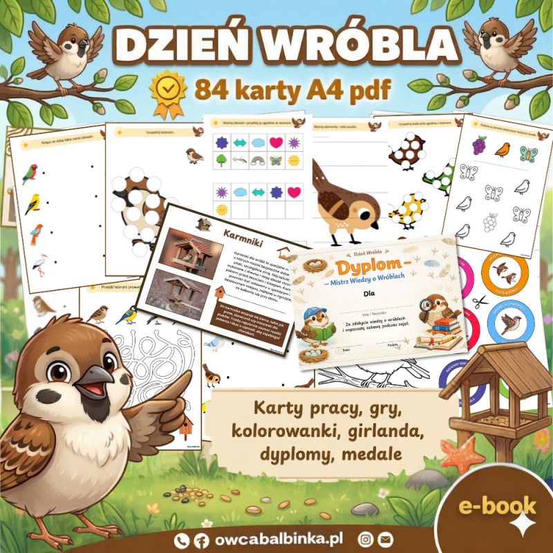 Zestaw na Dzień Wróbla to fajny sposób, żeby zainteresować dzieci przyrodą. Dzieci dowiadują się, kim jest wróbel, gdzie mieszka i jak wygląda jego życie. W materiałach są proste i ciekawe zadania, kolorowanki, gry oraz różne dodatki, które urozmaicają zajęcia. Są też dyplomy i odznaki, które sprawiają dzieciom dużą radość. Wszystko jest przygotowane tak, żeby dziecko nie czuło, że się „uczy”, tylko dobrze się bawi. To dobry wybór zarówno do przedszkola, jak i do wspólnej zabawy w domu.