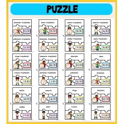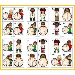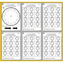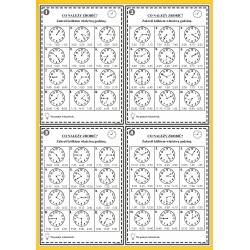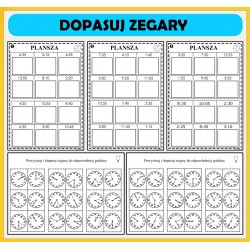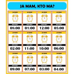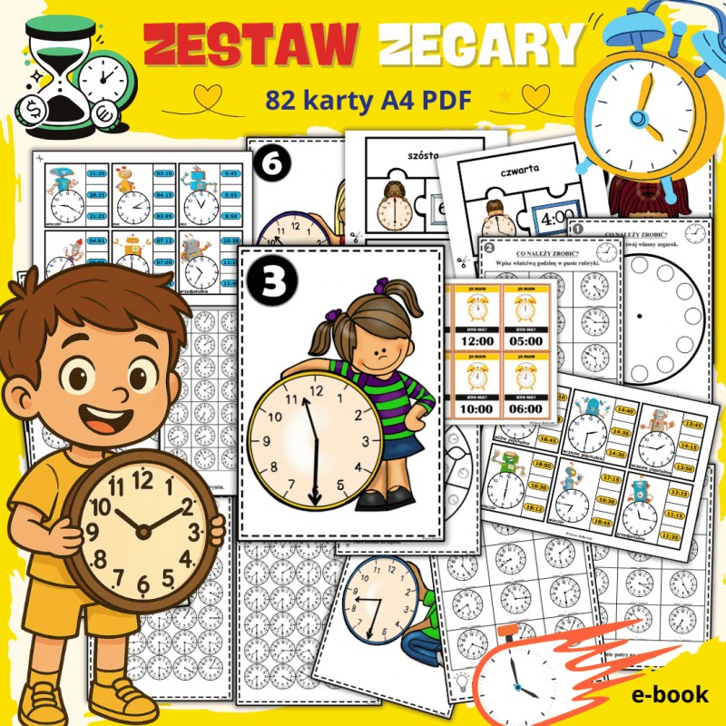 W skład zestawu wchodzi 14 części (82 karty A4 format pdf) + prezentacja multimedialna stworzona w Microsoft PowerPoint. Materiały są przeznaczone dla dzieci w wieku przedszkolnym i wczesnoszkolnym. Zestaw zawiera zadania dydaktyczne idealne do nauki godzin, zegara, a także przybliżające maluchom takie pojęcia jak dzień, noc, rano lub wieczór. Przygotowane karty kształtują u dzieci logiczne myślenie, koordynację wzrokowo-ruchową oraz pamięć.